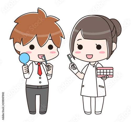 男性に歯磨き指導をする歯科衛生士の女性 全身 Adobe Stock でこのストックベクターを購入して 類似のベクターをさらに検索 Adobe Stock